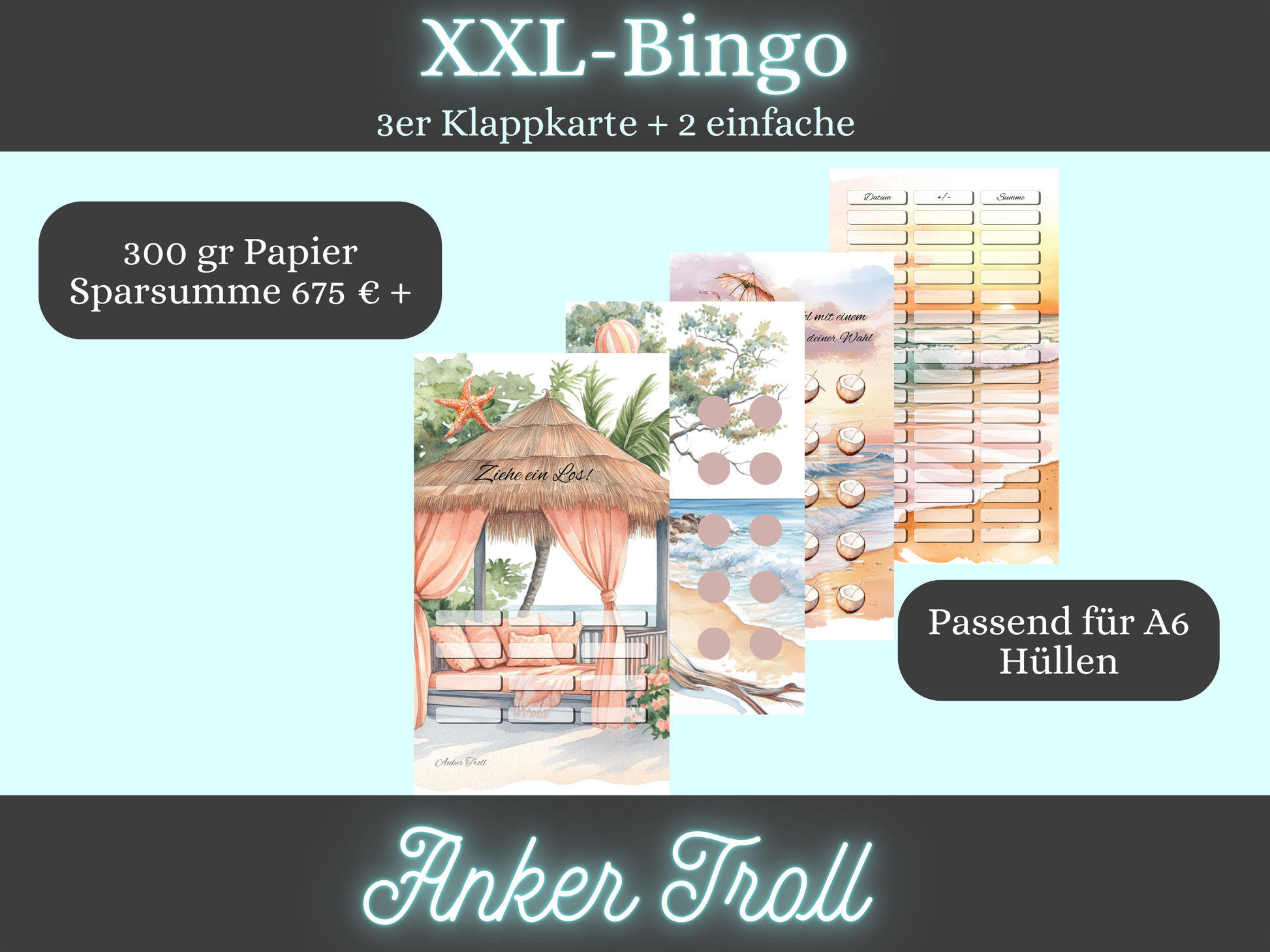 Das XXL-Bingo Urlaub besteht aus einer 3er Klappkarte und 2 einfachen Karten inkl. Tracker.